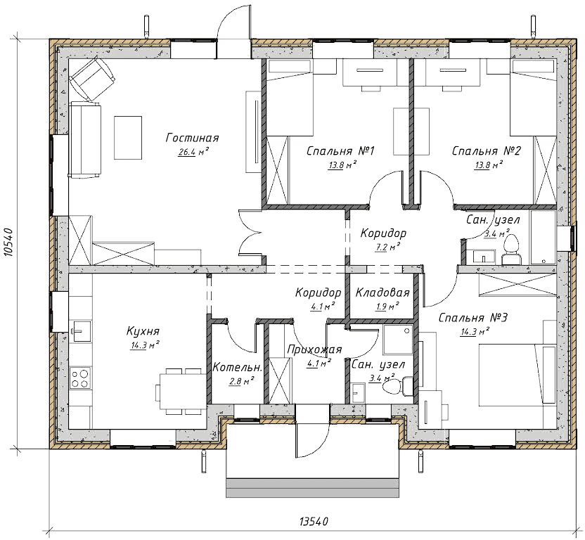 Кухня-гостиная с выходом на террасу, 3 спальни, кладовая