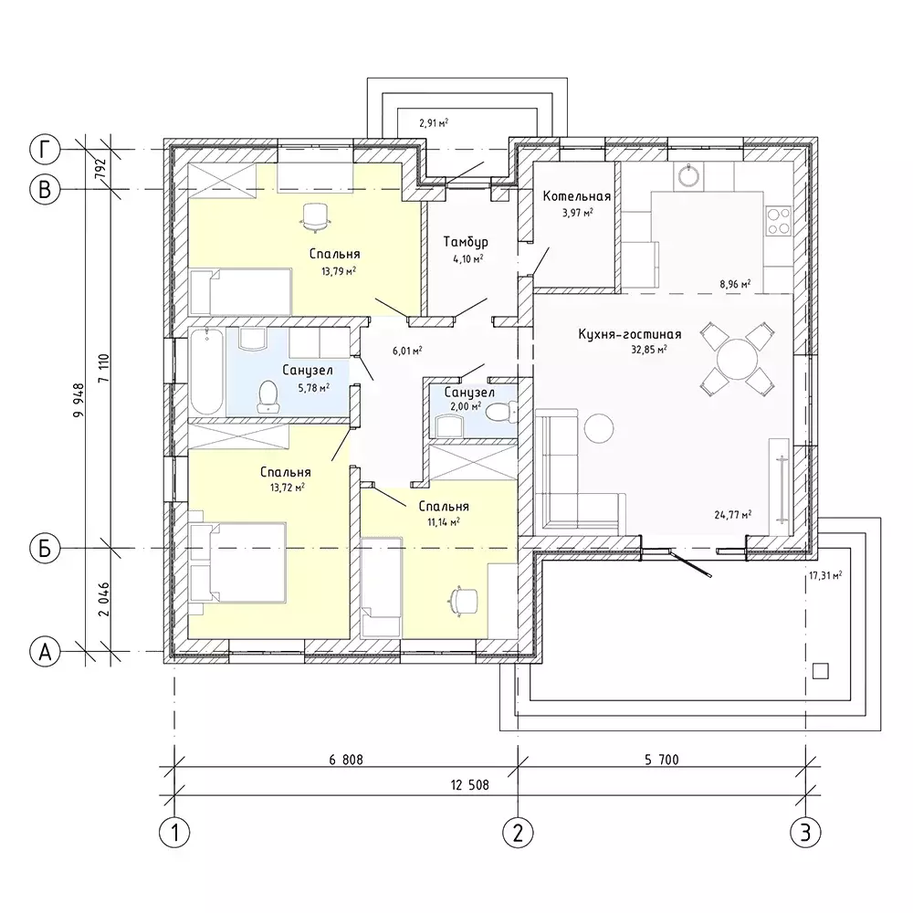 Дом «Вдохновение» — уютный и функциональный. Общая площадь дома составляет 100 квадратных метров, что позволяет комфортно разместиться семье.
